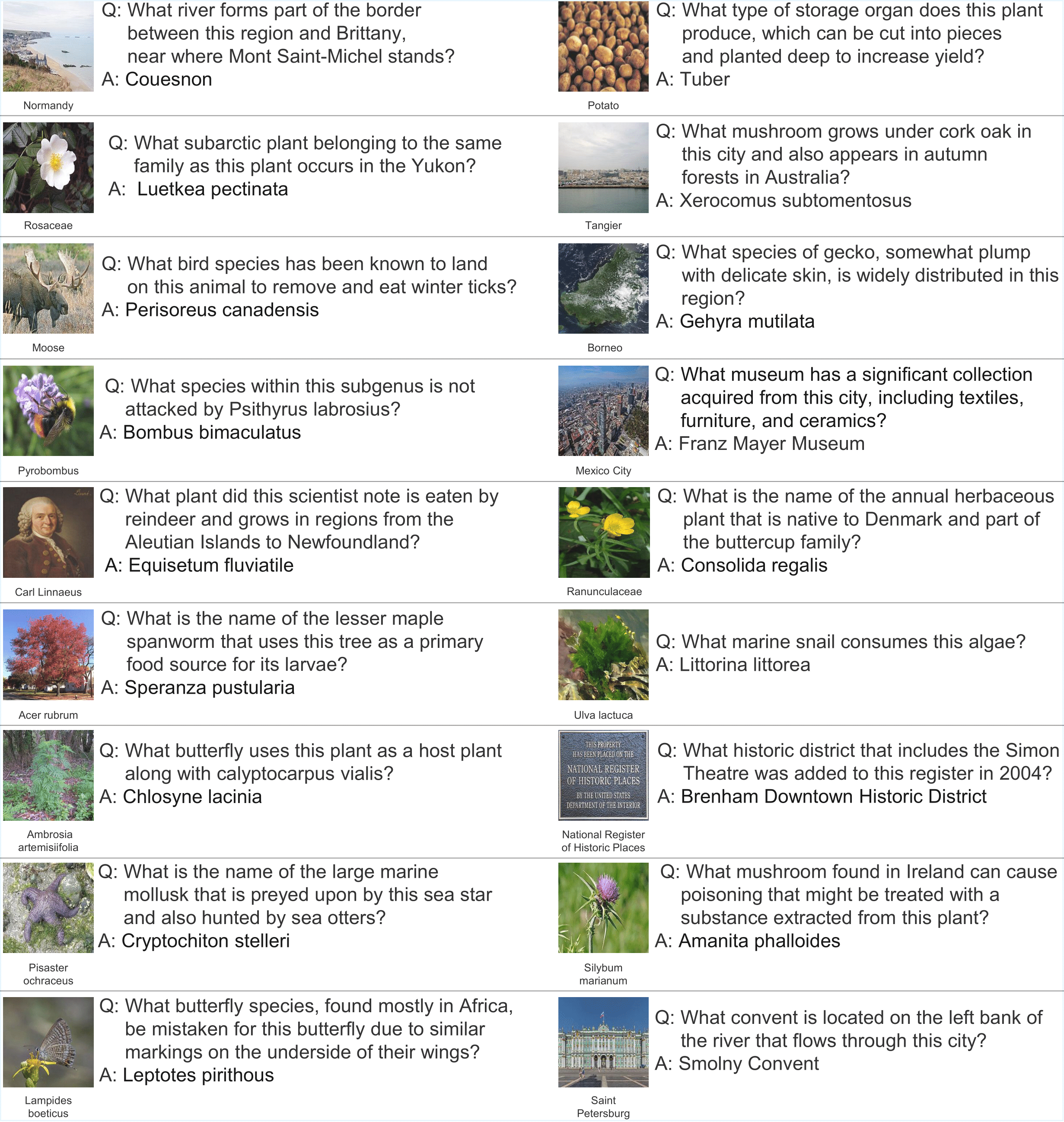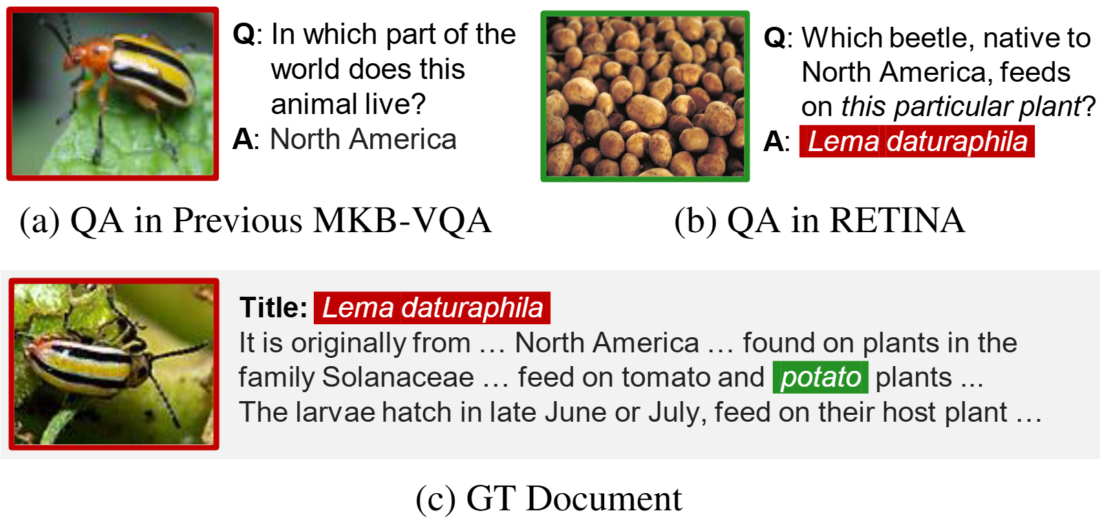 Qualitative Examples Existing MKB-VQA benchmarks are biased toward scenarios where the main entity of the target document typically has the same entity as the query image. To address this bias, we focus on collecting samples that do not permit such visual shortcuts, by deliberately selecting a query image that differ from the main entity of the target Wikipedia document.