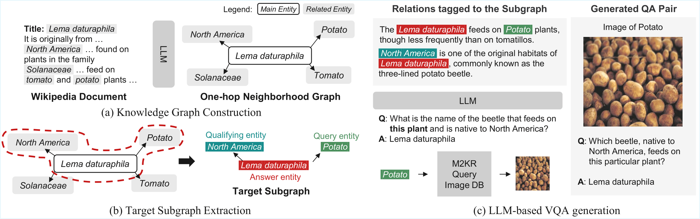 RETINA Benchmark Generation Pipeline (a) constructs one-hop neighborhood graphs by extracting named entities (gray box) related to the answer entity (white box) and their relations using an LLM; (b) samples an query entity (green) and qualifying entity (teal) to form a target subgraph with the answer entity (red); and (c) feeds the target subgraph into an LLM to generate a textual query and collect a corresponding image from M2KR Images. The query is then paraphrased to minimize lexical overlap with the document.