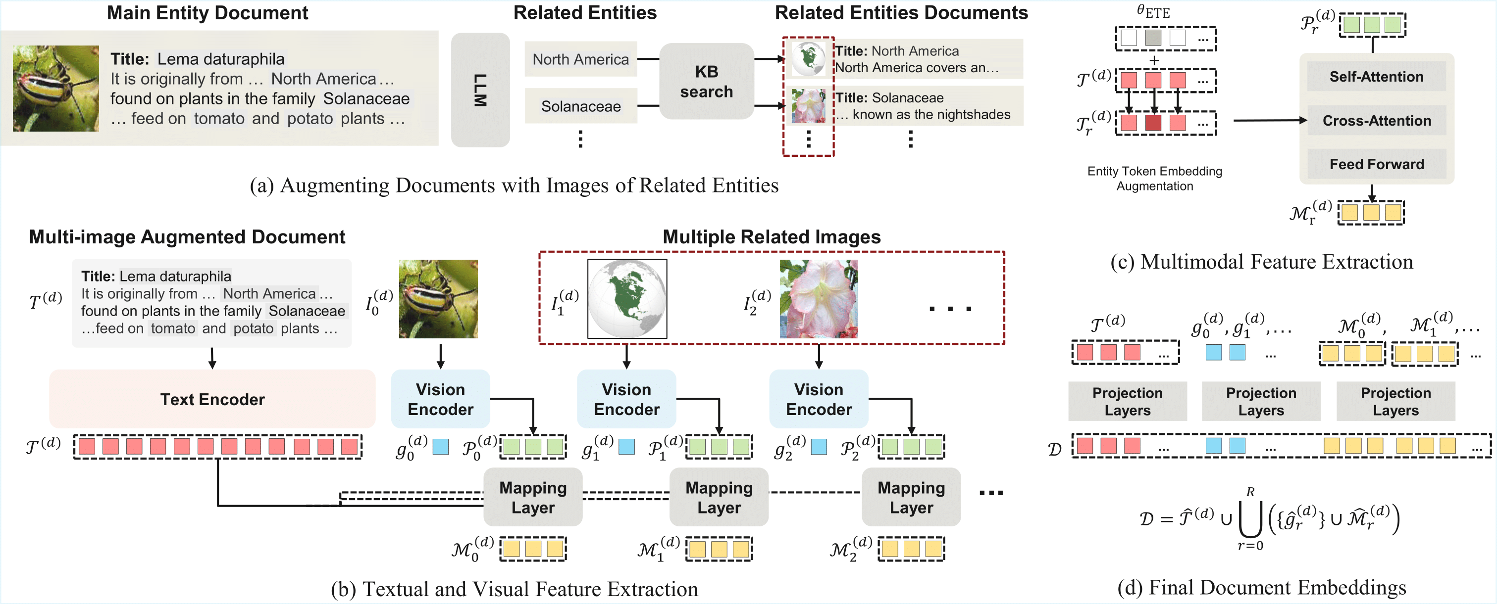 Overview of MIMIR Document Encoder Architecture. (a) given a document, related named entities are identified with an LLM, and corresponding images are collected from the KB; (b) textual, global image, and patch-level features are extracted, with patch features attending to textual features through cross-attention to yield multimodal features; and (c) entity token embeddings are incorporated into the textual features prior to cross-attention for richer contextualization; (d) the final document embedding jointly integrates textual, global, and multimodal features projected into the same embedding space.