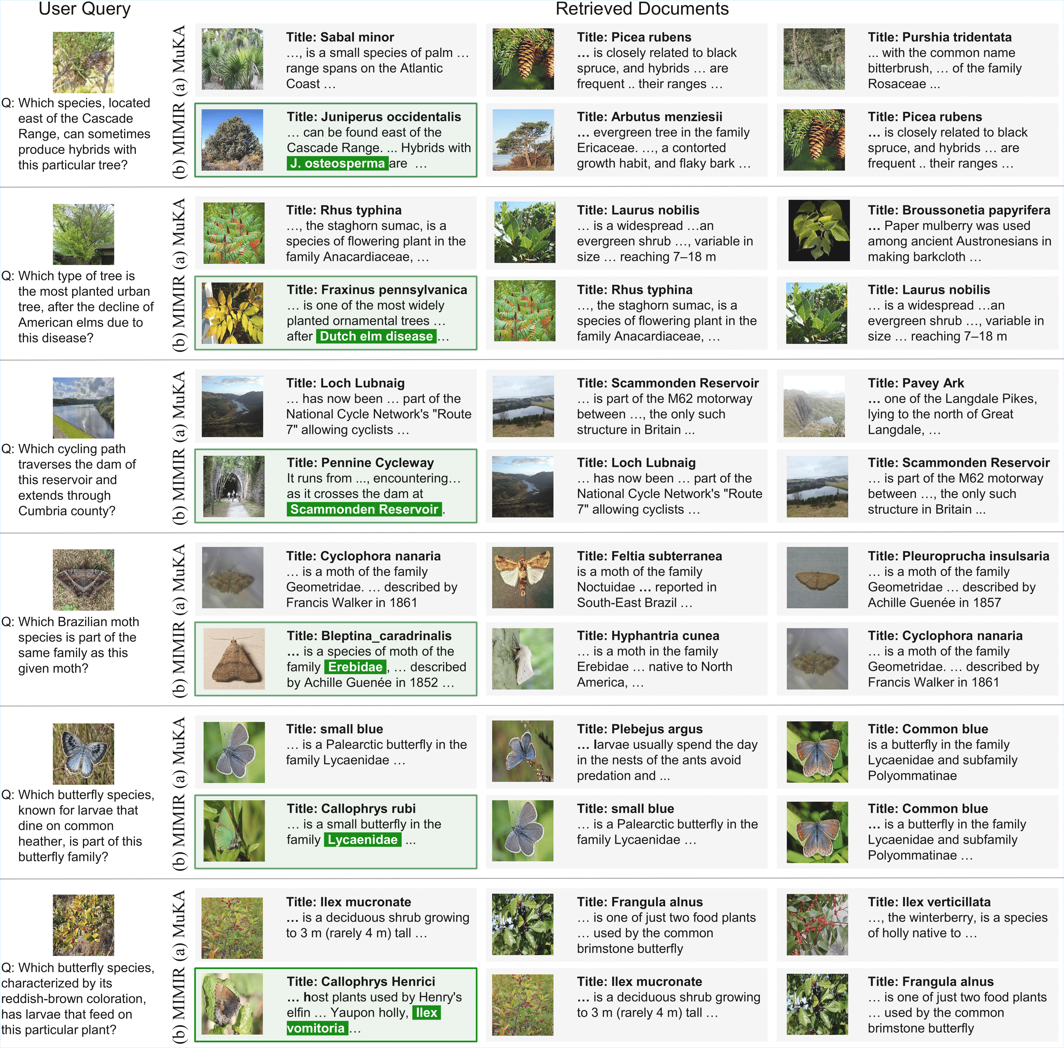 Qualitative Comparison of Retrieval on the RETINA Benchmark. Results for (a) single image baseline (MuKA) and (b) MIMIR. GT documents are shown in green, and the query entity within them is also highlighted in green. The single image baseline tends to rely on visual shortcuts, often retrieving documents with images that merely resemble the query. In contrast, MIMIR benefits from additional visual-similarity scoring based on multiple related image-augmented document embeddings, enabling it to correctly retrieve the GT document. These visual results illustrate that both textual and visual information must be jointly considered to solve the task.